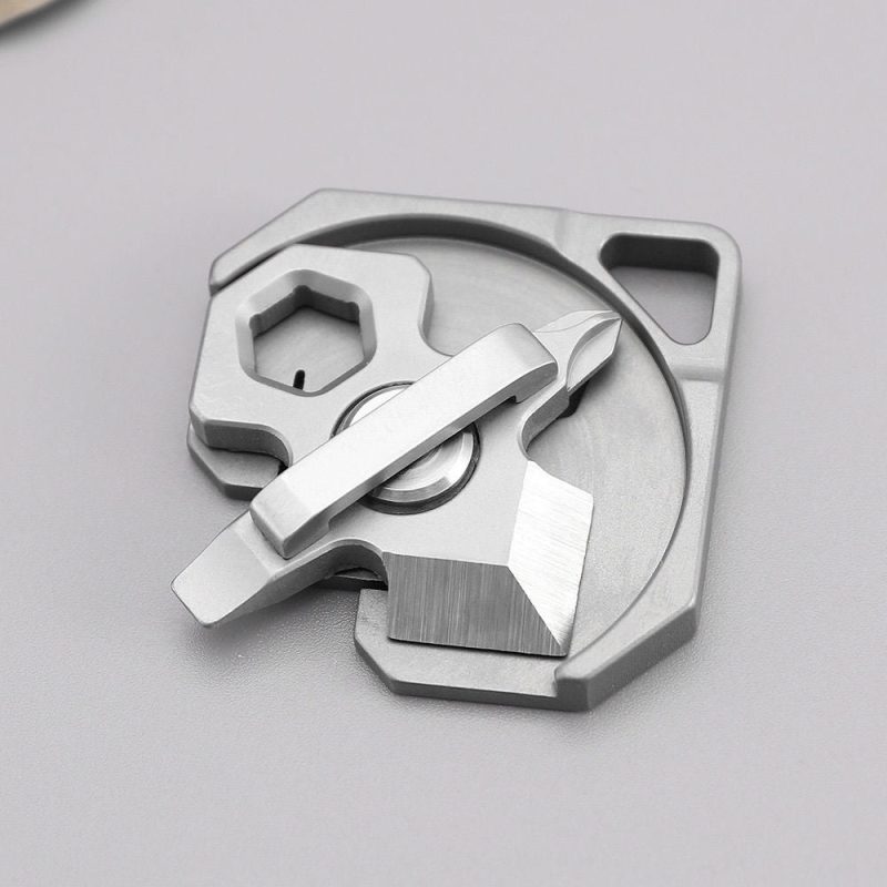 Size: 50mm*47mmBlade material: 5cr steelBase material: titanium alloySwivel handle: 5cr steelScrewdriver material: 5cr steelWeight: about 33g This is a multi-functional tool, which integrates emergency knife, screwdriver and hexagonal wrench. It is small and portable, and can bring convenience to life or outdoors.