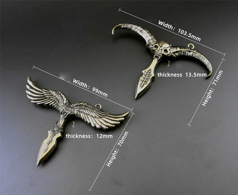 Material: zinc alloy Weight: Eagle about 76g, sheep about 56g Whether to sharpen: not sharpened (zinc alloy material does not have sharpness, can not be sharpened) Features: The product is made of metal casting with hanging holes, which can be used as a personalized pendant. Applicable scenarios: Equipped with the vehicle, it can be used as a life-saving hammer for emergency use; as a pendant for clothing, it can be used as a defense tool in an emergency. The function is simple and can be mastered without special practice. The product is exquisite and does not take up space